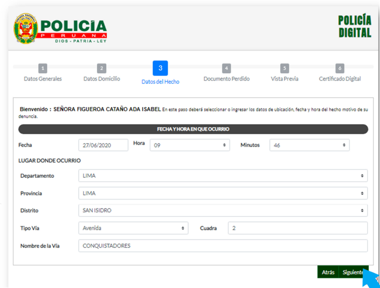 5Ingresar datos sobre la denuncia fecha,hora y lugar